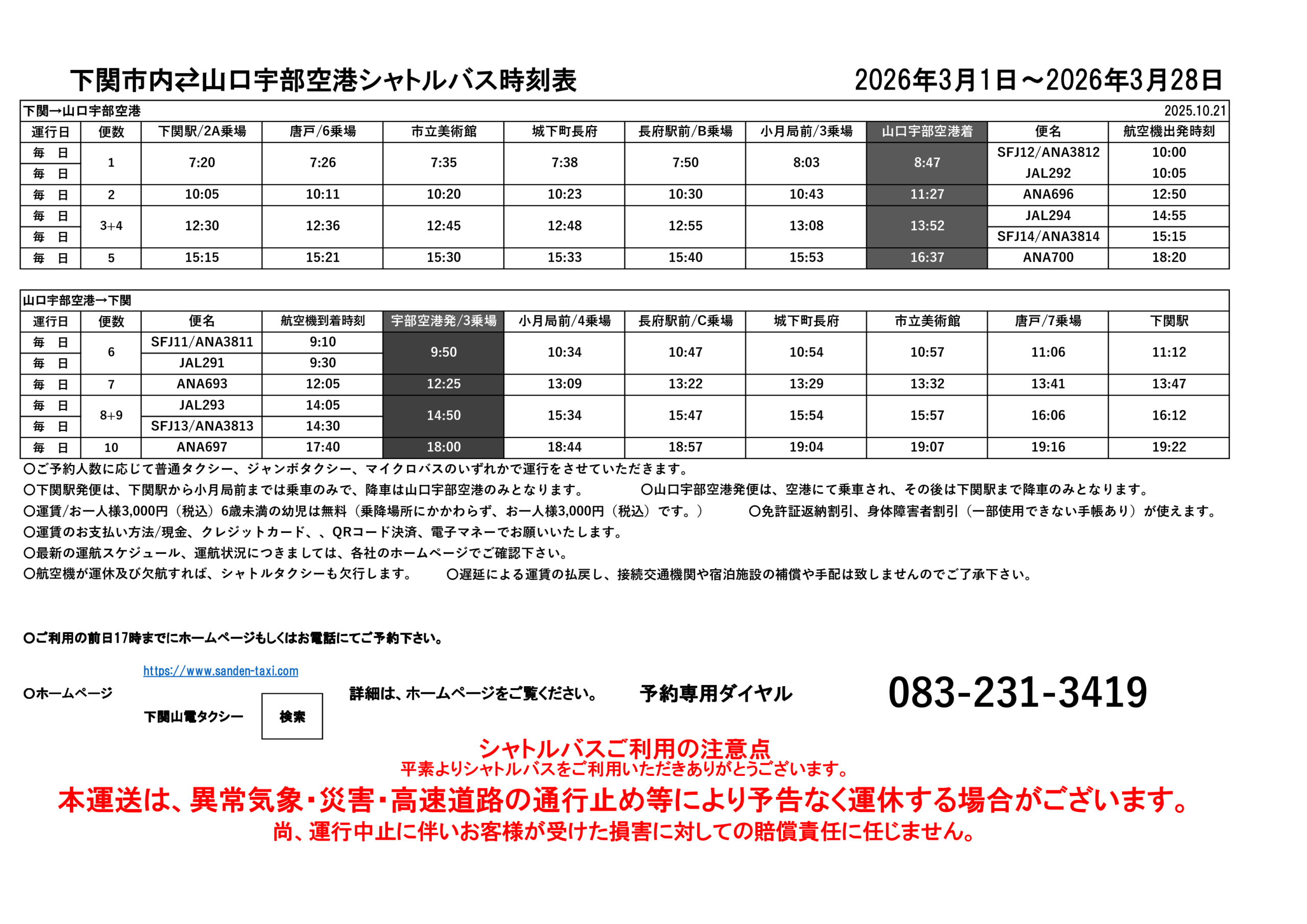 - 山口宇部空港発便は、空港にて乗車されその後下関駅まで降車のみとなります。